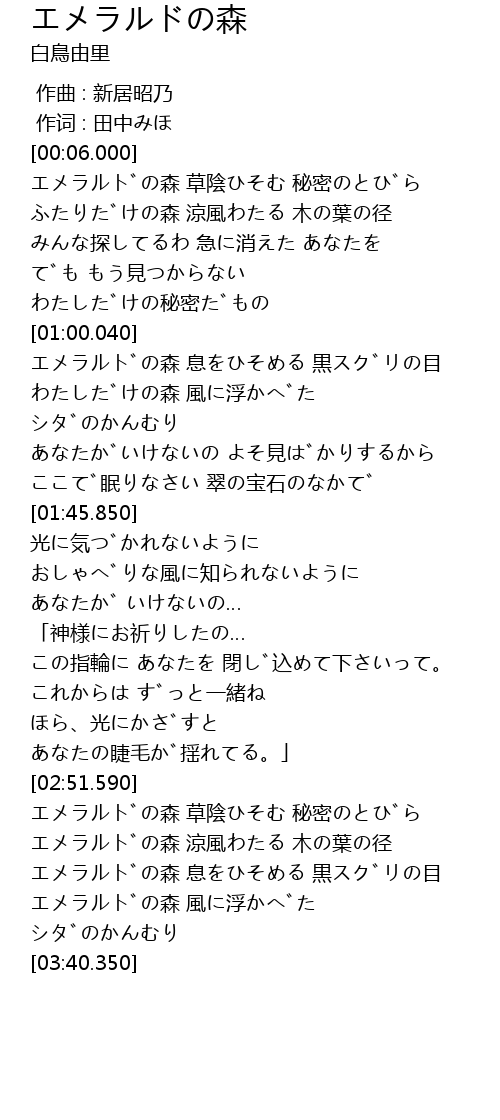 | [03:01.410] | エメラルドの森 草陰ひそむ 秘密のとびら |