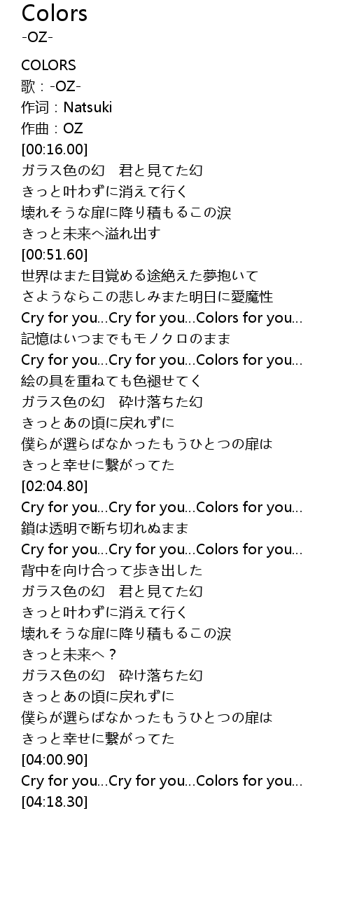 | [03:00.55] | Cry for you…Cry for you…Colors for you… |