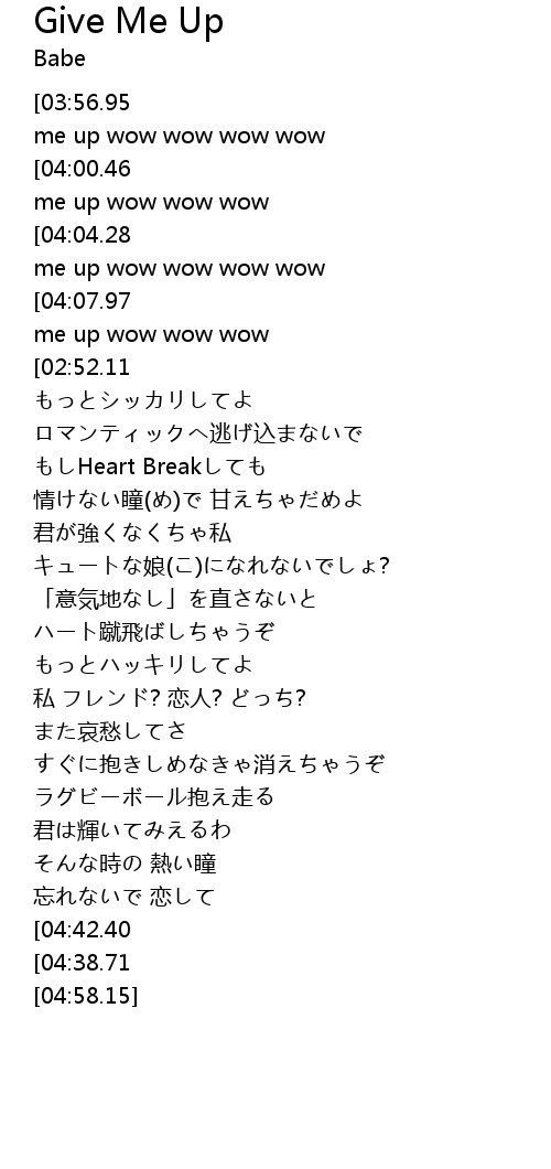 | [04:53.90][04:38.71][04:46.37][04:31.52] | Give me up wow wow wow wow |