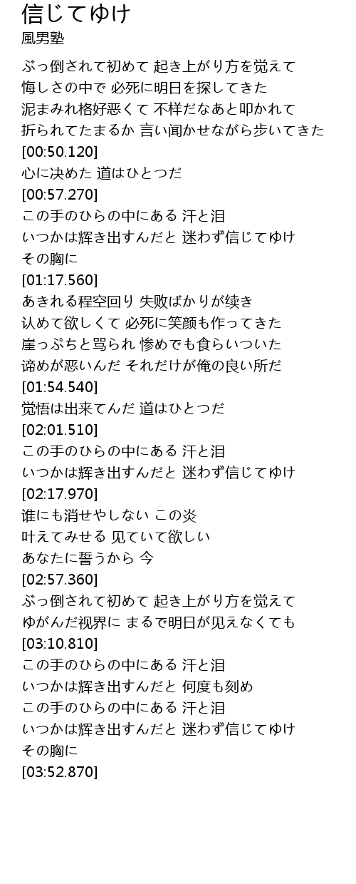 | [03:39.920] | いつかは辉き出すんだと 迷わず信じてゆけ |