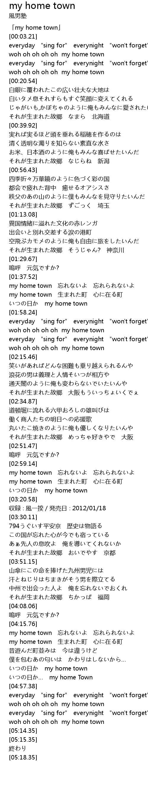 | [03:08.14] | my home town 生まれた町 心に在る町 |