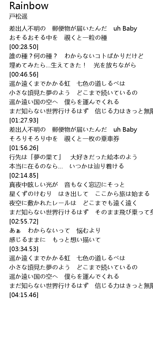 | [03:34.49] | 遥か遠くまでかかる虹 七色の道しるべは |