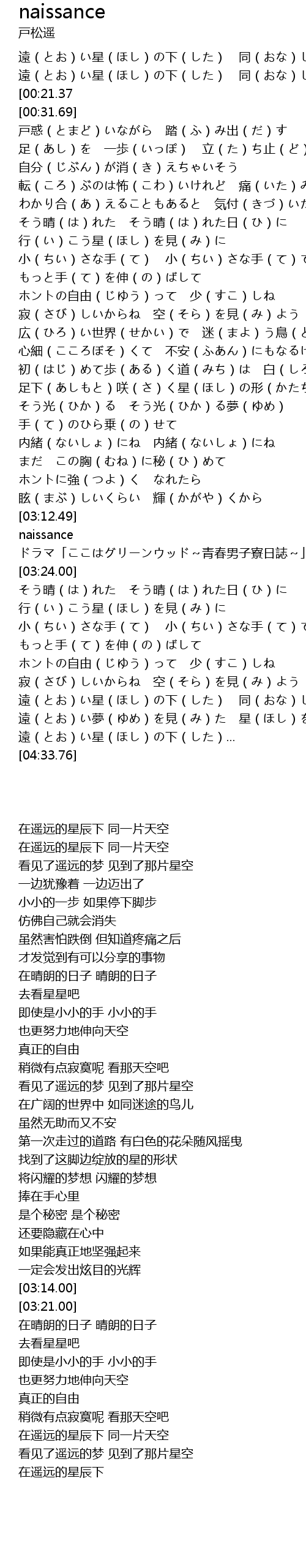 | [01:45.70][00:21.37] | 遠(とお)い夢(ゆめ)を見(み)た 星(ほし)を見(み)た |
