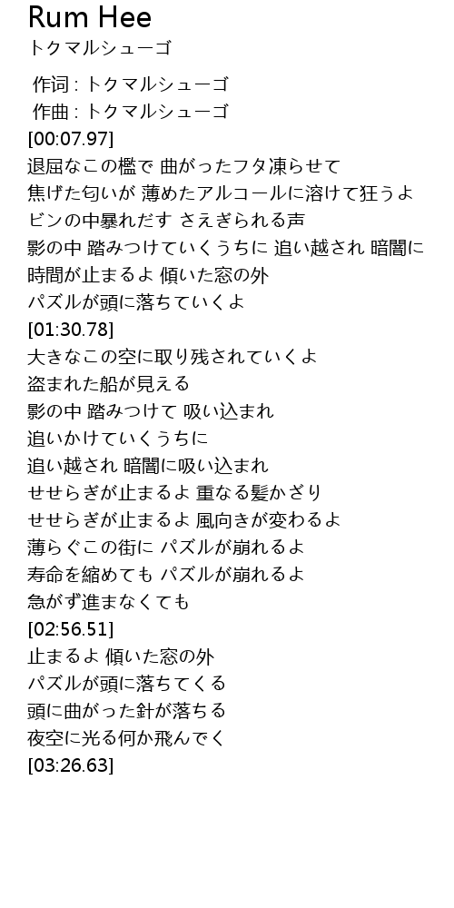 | [00:01.000] | 作曲 : トクマルシューゴ |