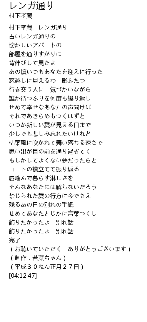 | [00:00.42] | 村下孝蔵 レンガ通り |