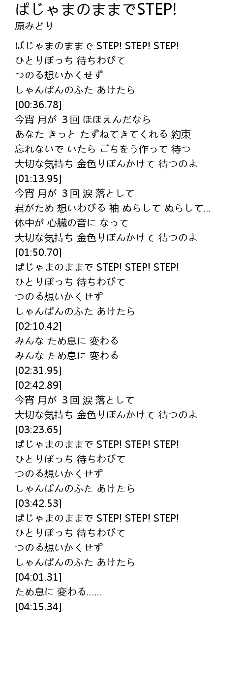 | [00:18.96] | ぱじゃまのままで STEP! STEP! STEP! |