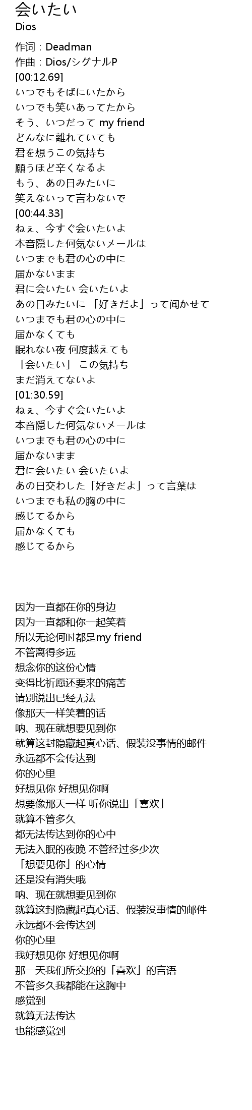 | [01:46.99] | ねぇ、今すぐ会いたいよ |