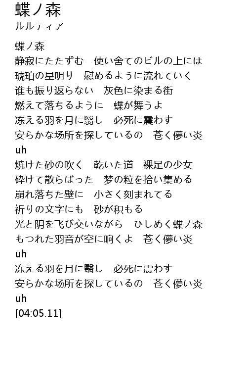 | [00:46.90] | 燃えて落ちるように 蝶が舞うよ |