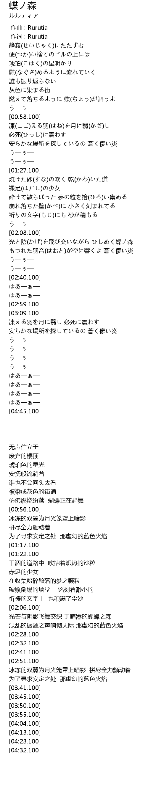 | [02:09.100] | 光と陰(かげ)を飛び交いながら ひしめく蝶ノ森 |