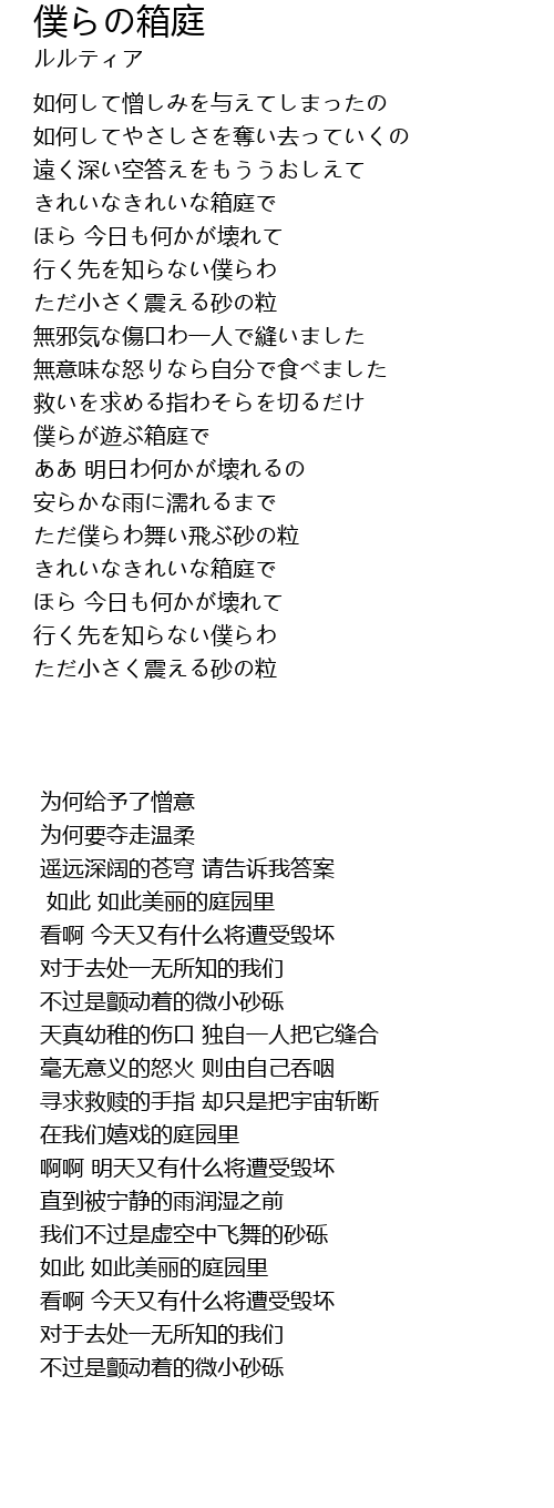 | [03:10.190] | きれいなきれいな箱庭で |