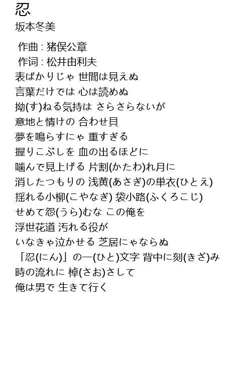 | [03:19.32] | 「忍(にん)」の一(ひと)文字 背中に刻(きざ)み |