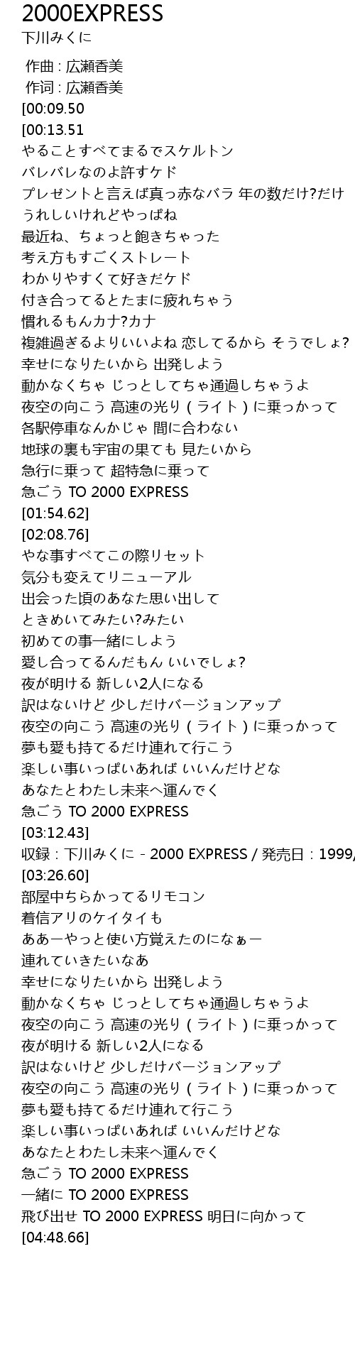 | [03:14.43] | 収録:下川みくに - 2000 EXPRESS/発売日:1999/10/20 |