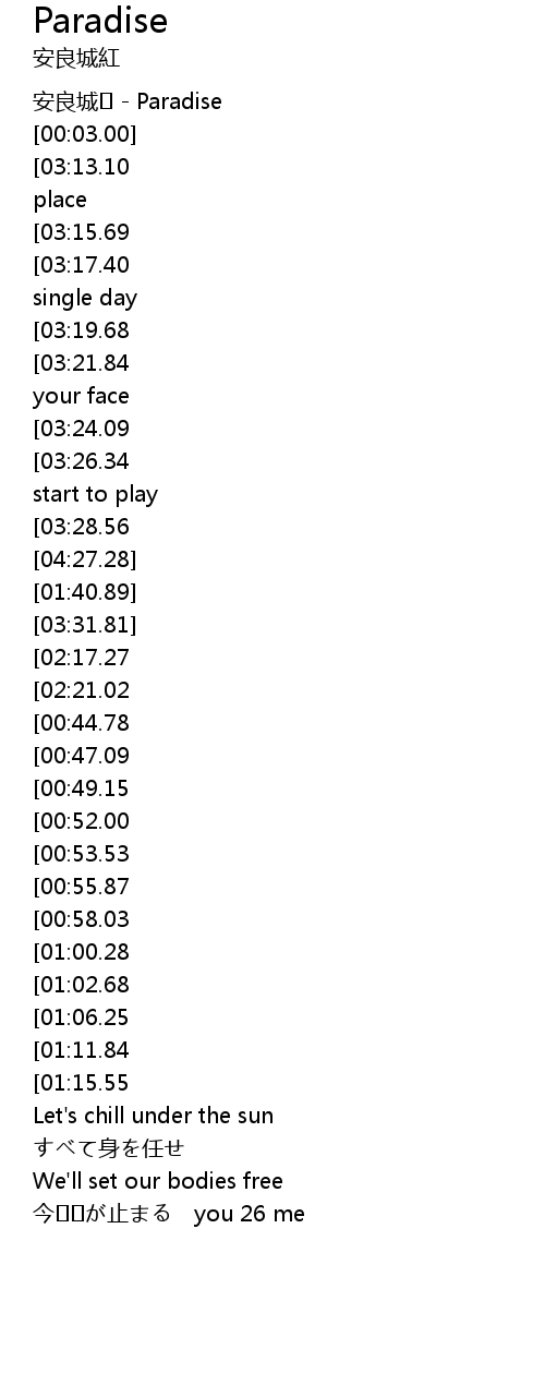 | [04:20.31][03:24.09][02:10.11][01:34.02][00:20.12] | �けた肌に吹く� |