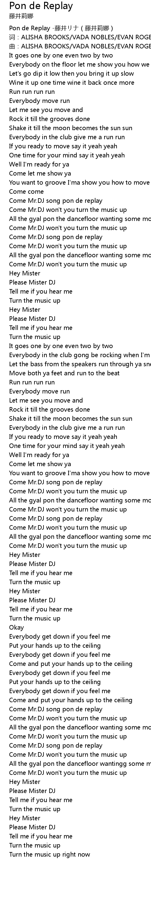| [00:53.354] | Come Mr.DJ song pon de replay |