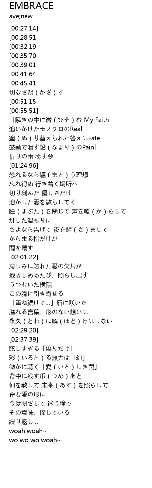 | [01:05.46] | 「瞬きの中に潜(ひそ)む My Faith |