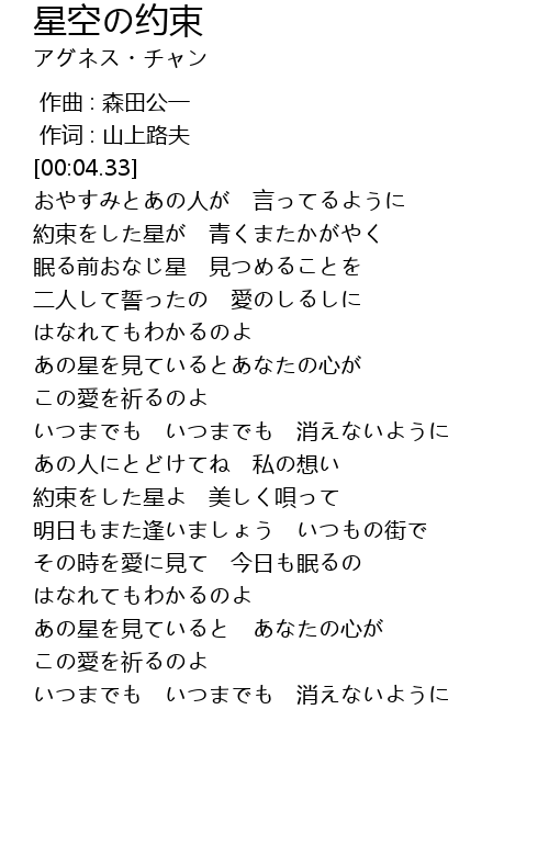 | [00:15.31] | 約束をした星が 青くまたかがやく |