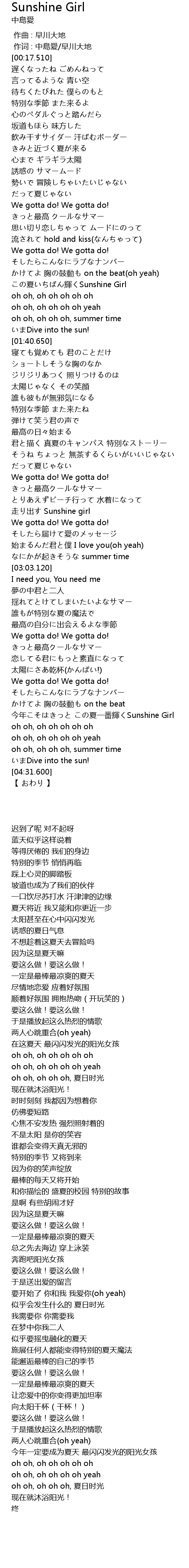 | [04:06.330] | 今年こそはきっと この夏一番輝くSunshine Girl |