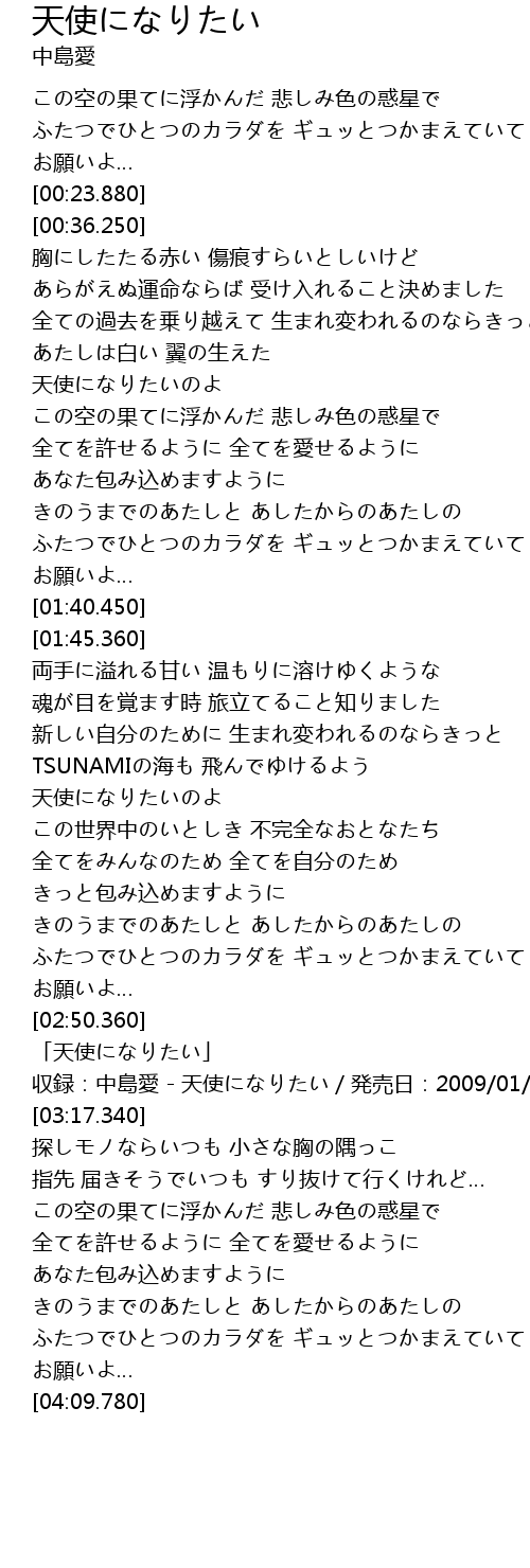 | [02:57.360] | 収録:中島愛 - 天使になりたい/発売日:2009/01/28 |