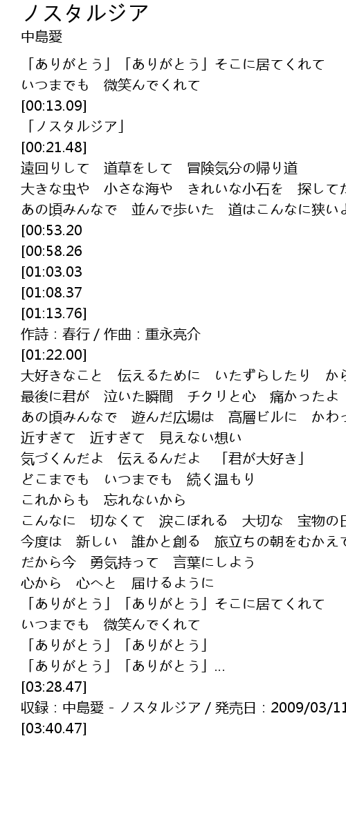 | [03:30.47] | 収録:中島愛 - ノスタルジア/発売日:2009/03/11 |