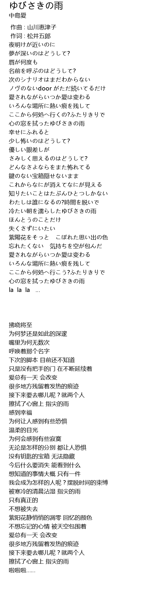 | [02:44.07] | 冷たい朝を濡らしたゆびさきの雨 |