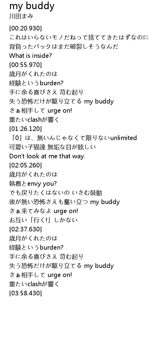 | [02:22.580] | 後が無い恐怖さえも奮い立つ my buddy |