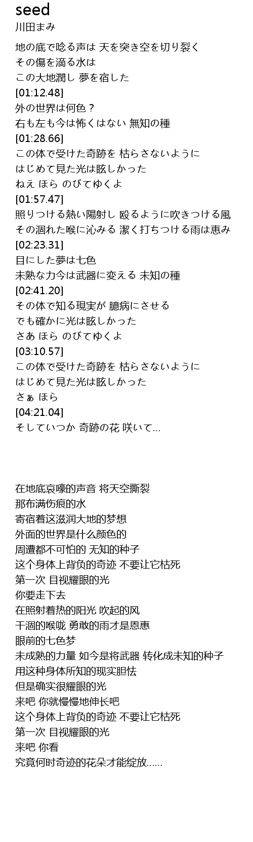 | [02:30.37] | 未熟な力今は武器に変える 未知の種 |