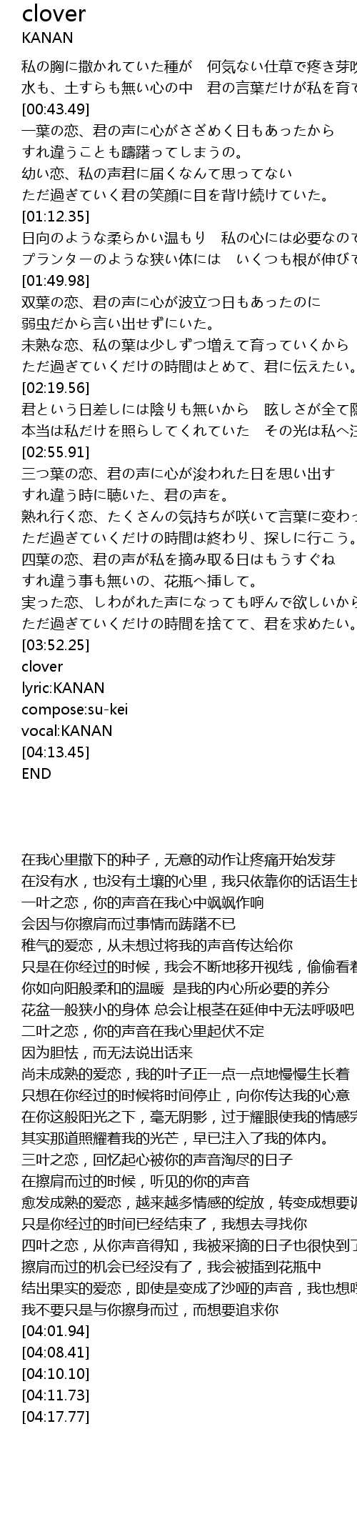 | [03:22.63] | 四葉の恋、君の声が私を摘み取る日はもうすぐね |