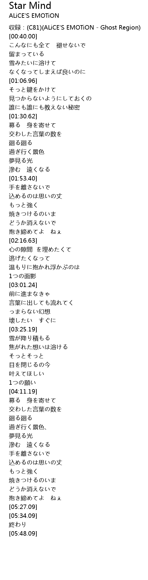 | [00:16.00] | 収録:(C81)(ALiCE'S EMOTiON - Ghost Region) |