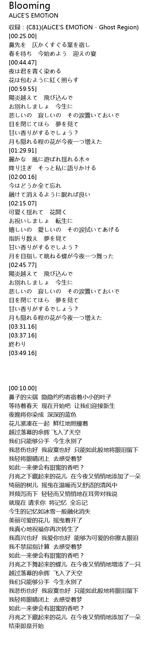| [00:10.00] | 収録:(C81)(ALiCE'S EMOTiON - Ghost Region) |
