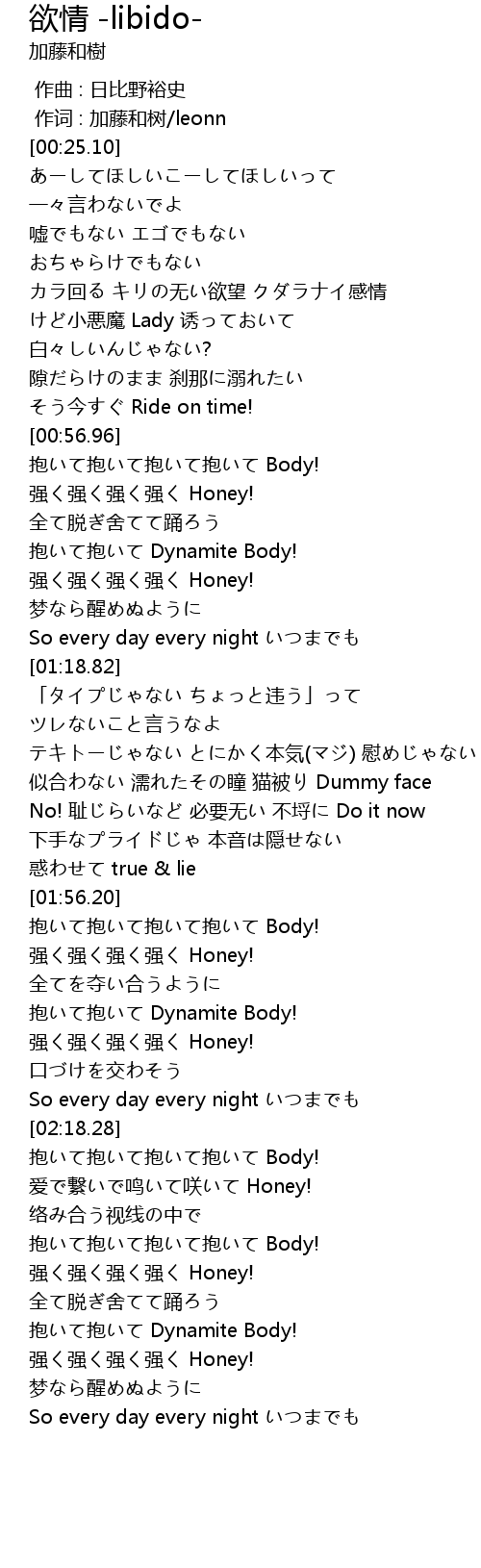 | [01:00.22] | 抱いて抱いて抱いて抱いて Body! |
