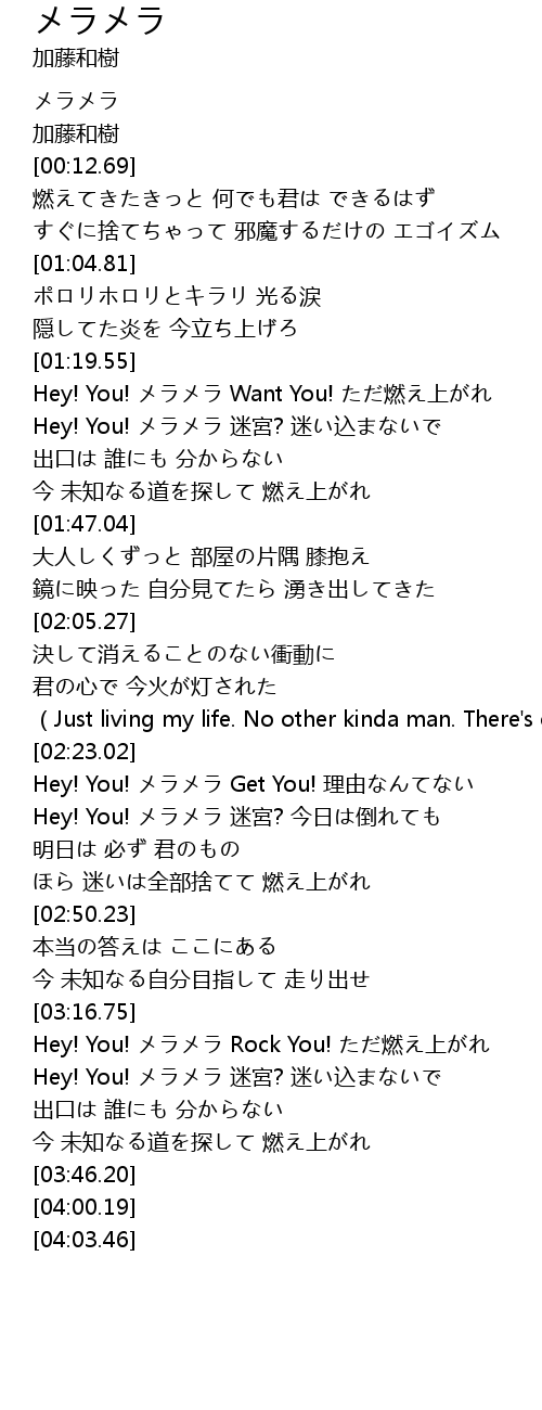 | [03:17.00] | Hey! You! メラメラ Rock You! ただ燃え上がれ |