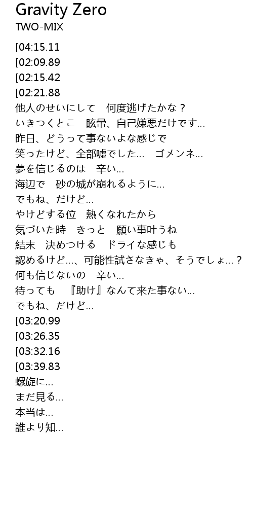 | [04:23.65][02:15.42][00:58.52] | 本当は、今もあきらめきらない事 |