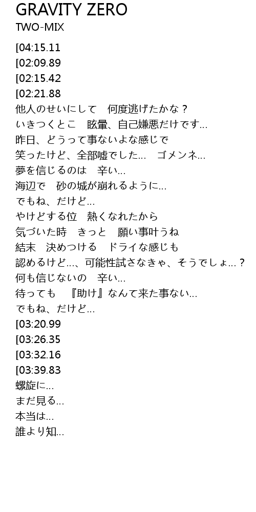 | [04:23.65][02:15.42][00:58.52] | 本当は、今もあきらめきらない事 |
