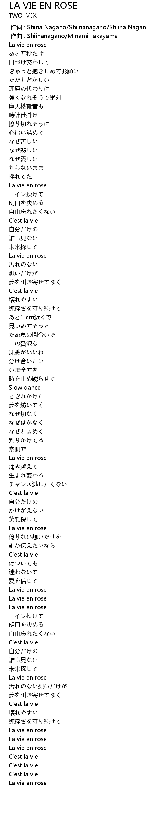 | [00:00.000] | 作词 : Shina Nagano/Shiinanagano/Shiina Nagano/Minami Takayama |