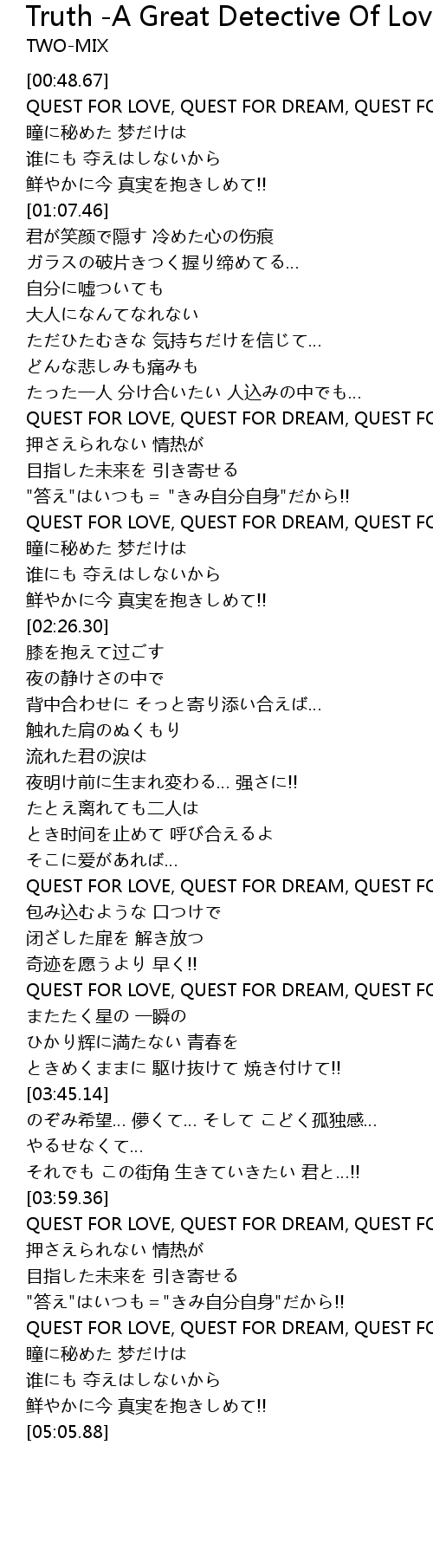 | [01:58.51] | QUEST FOR LOVE, QUEST FOR DREAM, QUEST FOR ALL TRUTH!! |