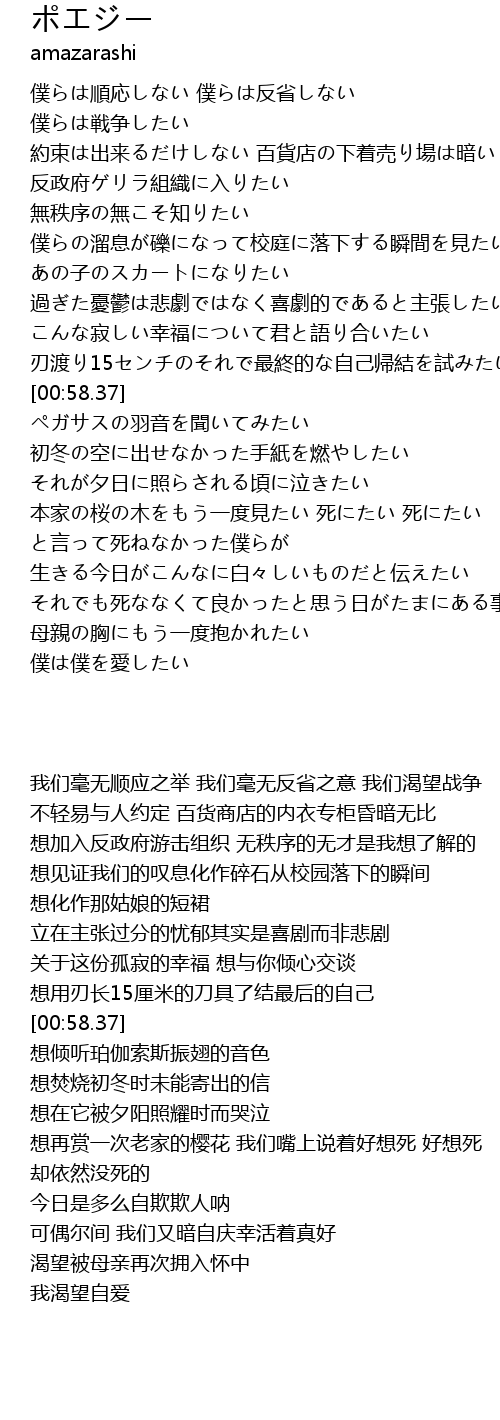 | [00:36.90] | 反政府ゲリラ組織に入りたい 無秩序の無こそ知りたい |