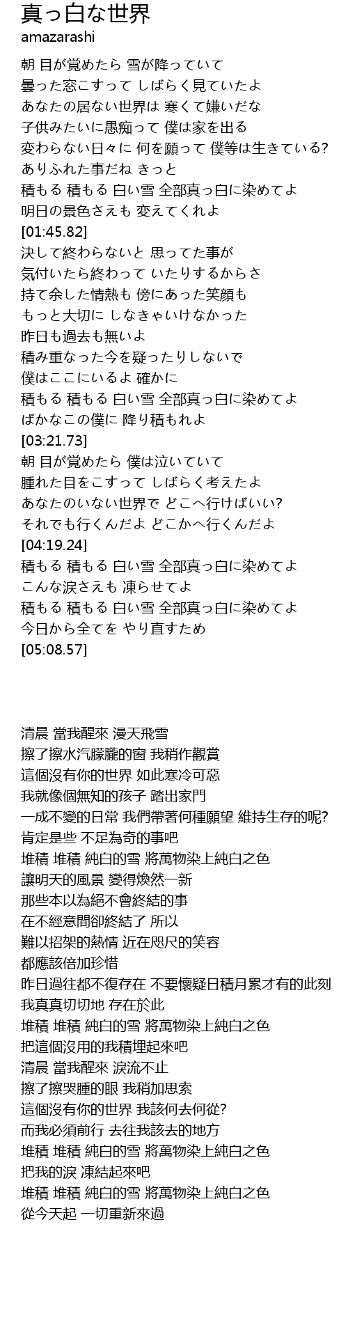 | [04:48.60] | 積もる 積もる 白い雪 全部真っ白に染めてよ |