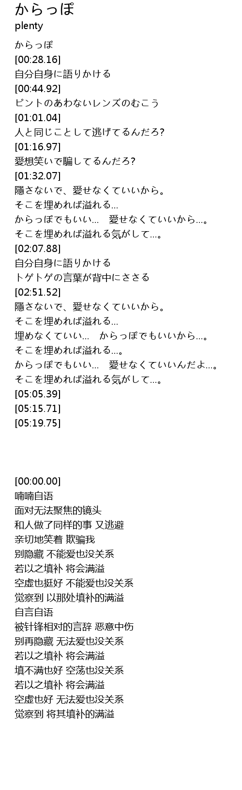 | [04:15.72] | 埋めなくていい... からっぽでもいいから...。 |