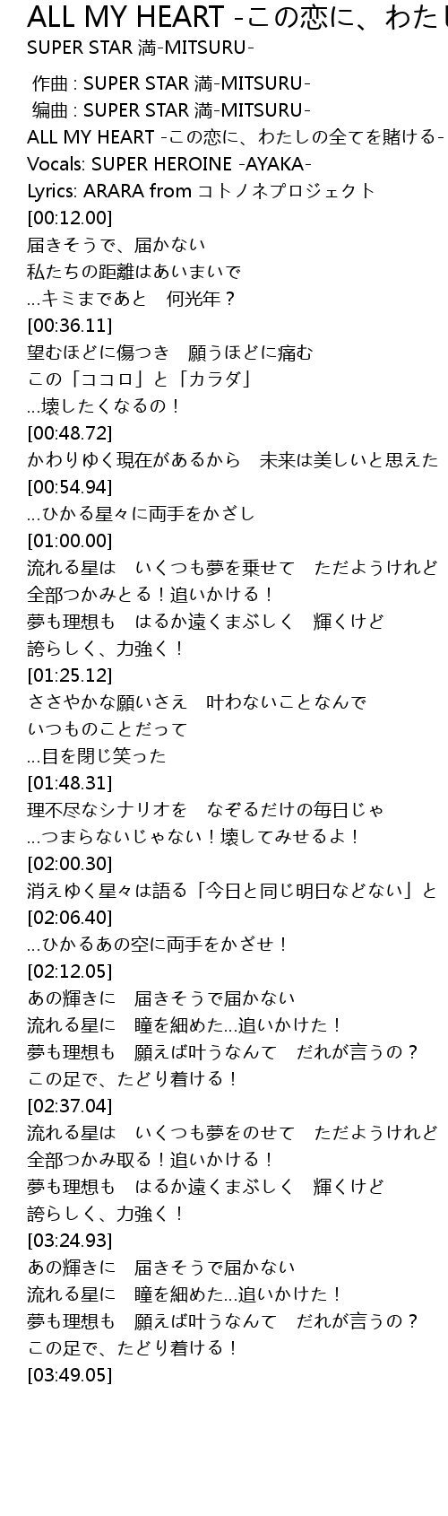 | [00:00.00] | ALL MY HEART -この恋に、わたしの全てを賭ける- |