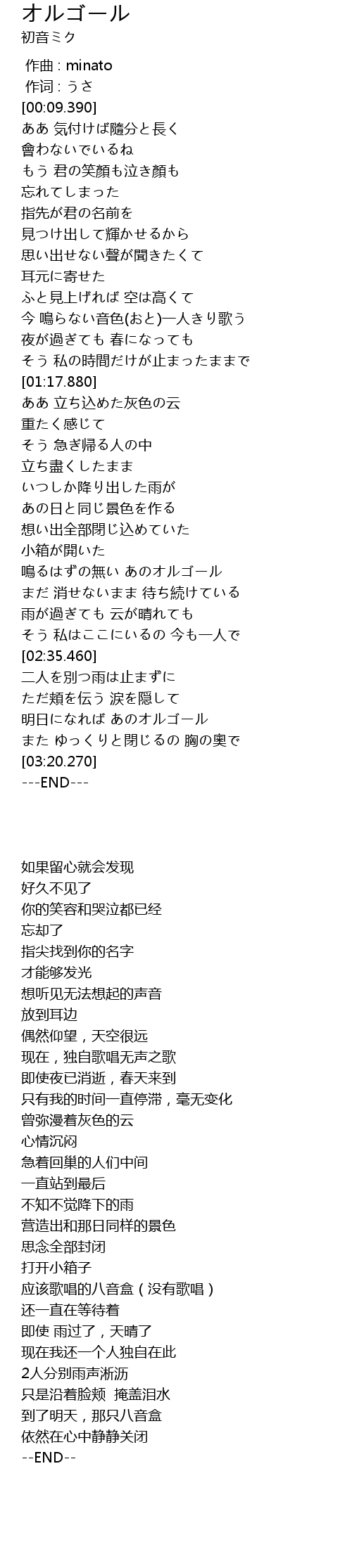 | [02:11.580] | 鳴るはずの無い あのオルゴール |
