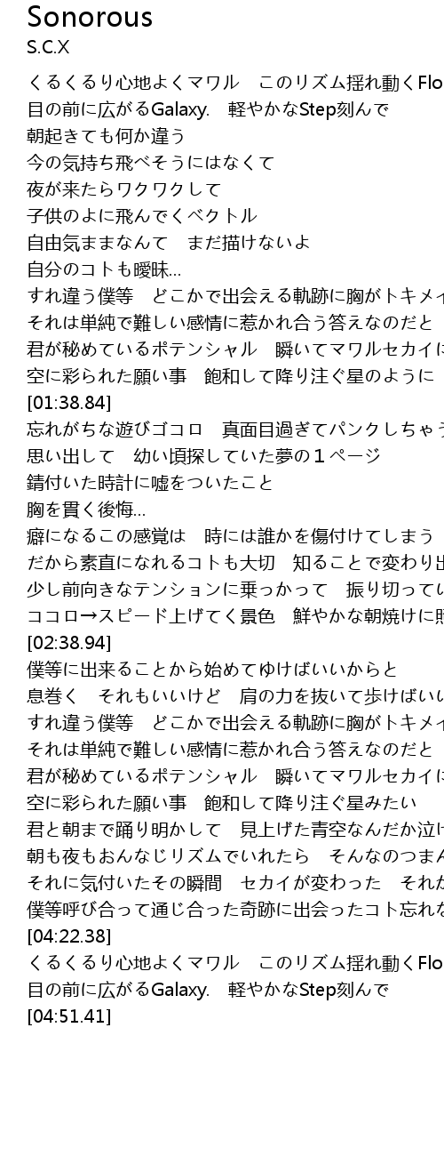 | [04:38.78] | 目の前に広がるGalaxy. 軽やかなStep刻んで |
