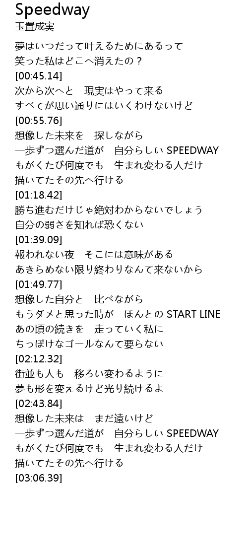 | [02:49.57] | 一歩ずつ選んだ道が 自分らしい SPEEDWAY |