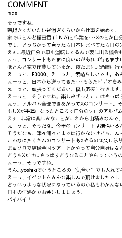 | [02:13.90] | えっ、アルバム全部できあがってXのコンサート。そうですね、地方まわれるらしいから、それが一番楽しみかな? |