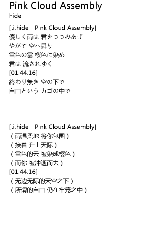 | [01:34.12] | 雪色の雲 桜色に染め |