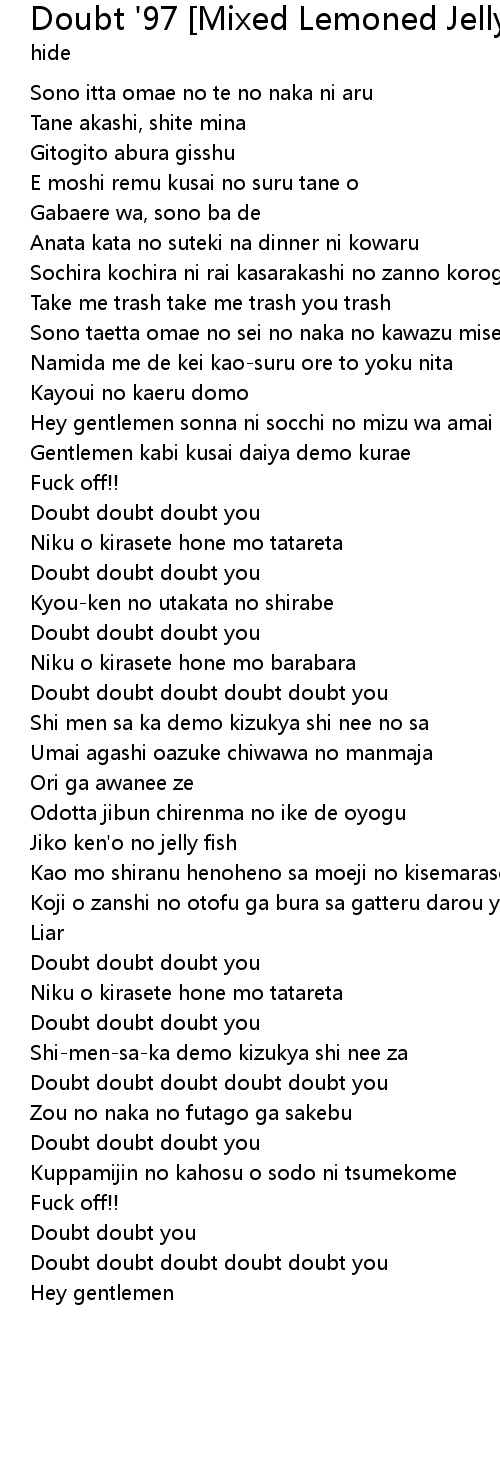 | Sono taetta omae no sei no naka no kawazu misete mina | |