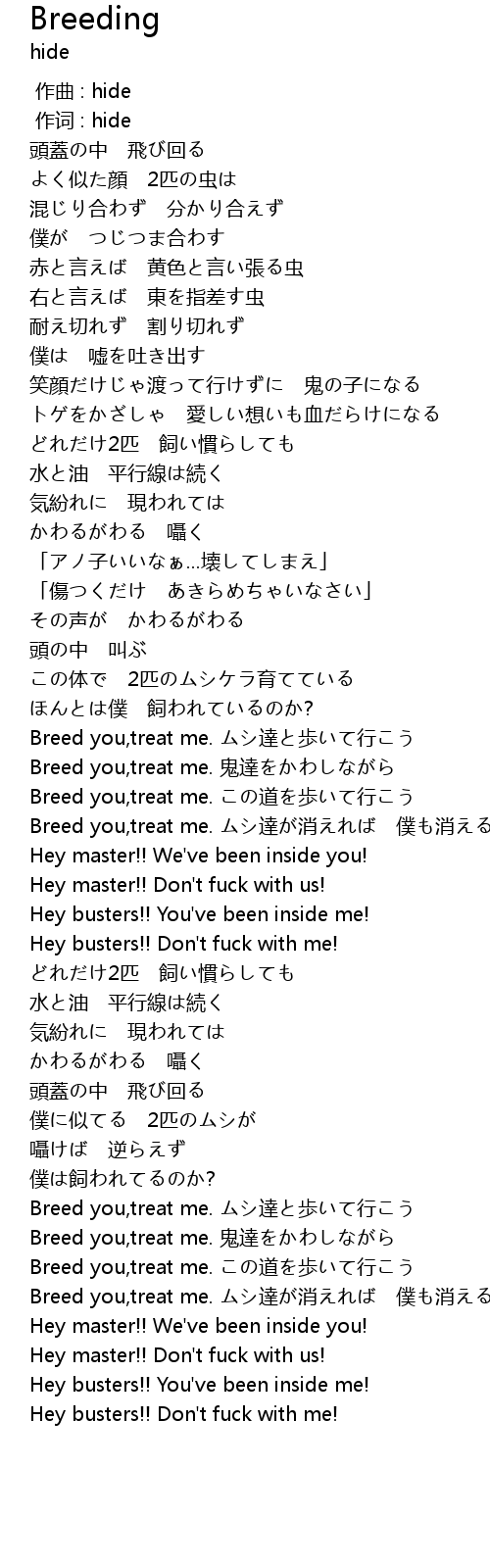 | [02:24.52] | Breed you,treat me. ムシ達が消えれば 僕も消える |