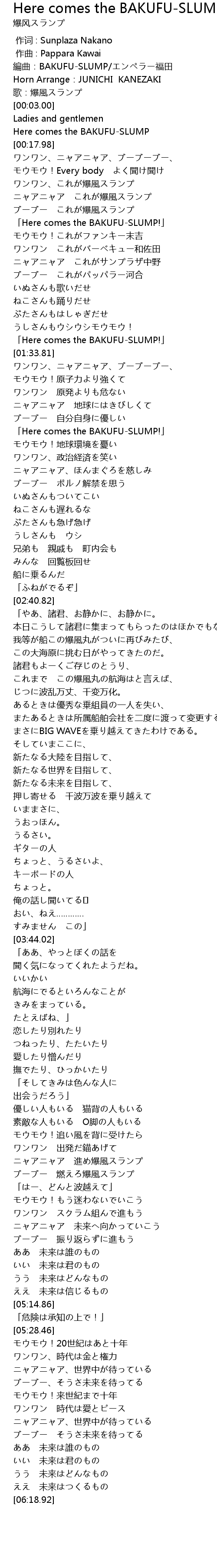 | [00:09.28] | Here comes the BAKUFU-SLUMP |