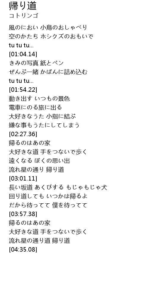 | [04:16.97] | 流れ星の通り道 帰り道 |