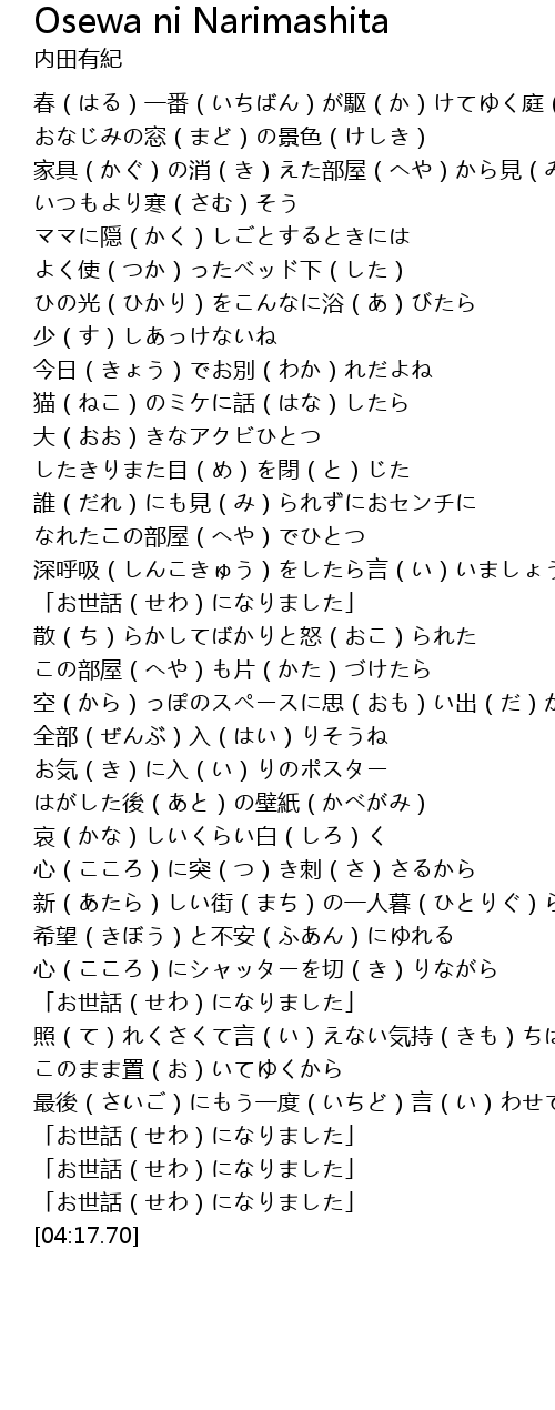 | [03:42.69] | 「お世話(せわ)になりました」 |