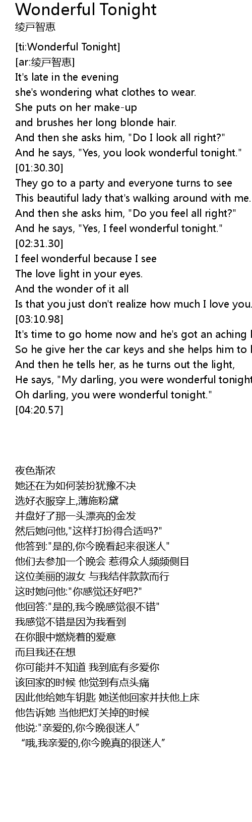 | [01:20.81] | And he says, "Yes, you look wonderful tonight." |
